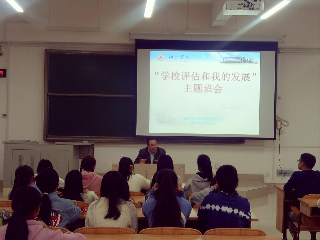 为深入推进学校评估和学风建设,加强员工的自我管理和对学校的深入了解。太阳成tyc33455ccwww于11月26日下午在东区弘毅楼2-402教师召开“学校评估与我的发展”主题班会,2019级汉语国际教育班同学及副班主任李克忠参加,班主任郎耀秀主持。
