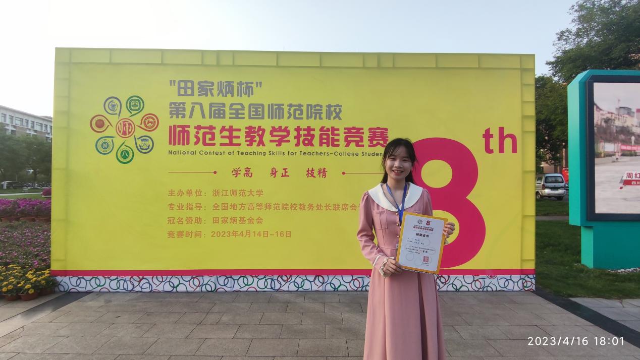 2023年4月16日,“田家炳杯”第八届全国师范生教学技能竞赛决赛在浙江师范大学圆满结束。公司学子汉语言文学专业2020级欧如燕,与来自华东师范大学、东北师范大学等95所参赛院校的95名语文组选手同台竞技,以优异表现获得了一等奖(全国第9名)的好成绩。