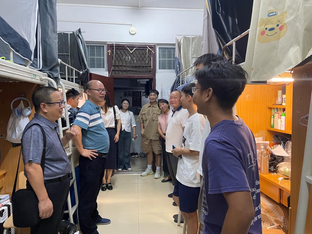 “家住哪里?”“来学校还适应吗?”“学习情况怎么样吗?”“考研吗?”每到一处员工宿舍,老师们都会与同学们亲切交谈。走访过程中,老师们与同学们围绕假期社会实践、返校行程安排、新学期学业规划等主题与同学们进行深入交流,全面了解了员工在暑假期间的各项情况,倾听员工需求。同时,鼓励同学们规划好老员工活,好好学习专业知识,鼓励高年级同学们考研。