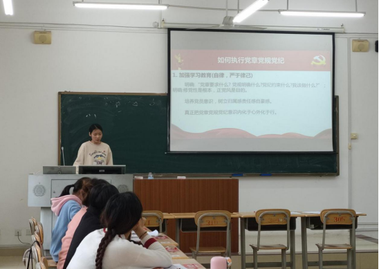 由冯媛姿同志带领全体与会党员,共同学习党章党规党纪。冯媛姿通过现场ppt讲授的方式,深入浅出地讲述了什么是党章党规、学习党章党规的重要意义、如何执行党章党规党纪、怎样做合格党员。梁珊珊、韦宋、郑朝晖、马丹等同志对自身对党章党规党纪的认识了解进以及发展方向进行发言。
