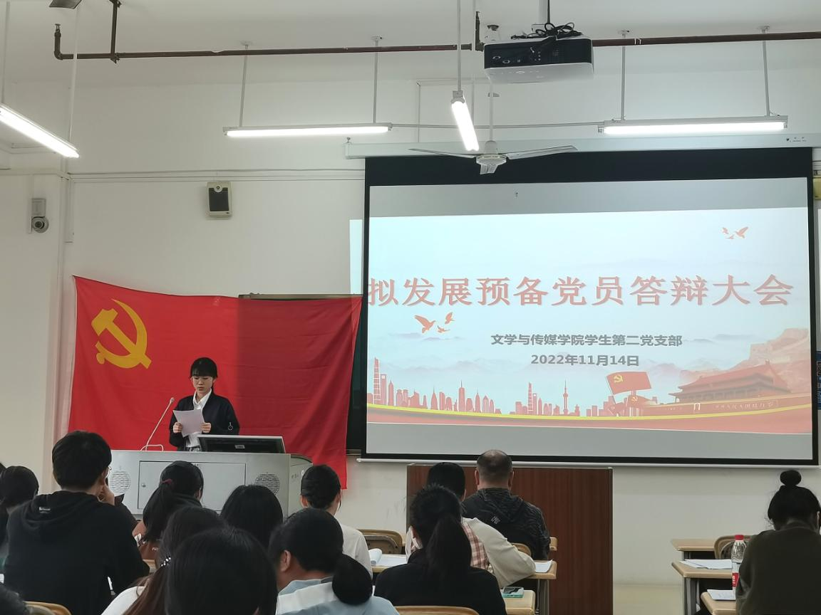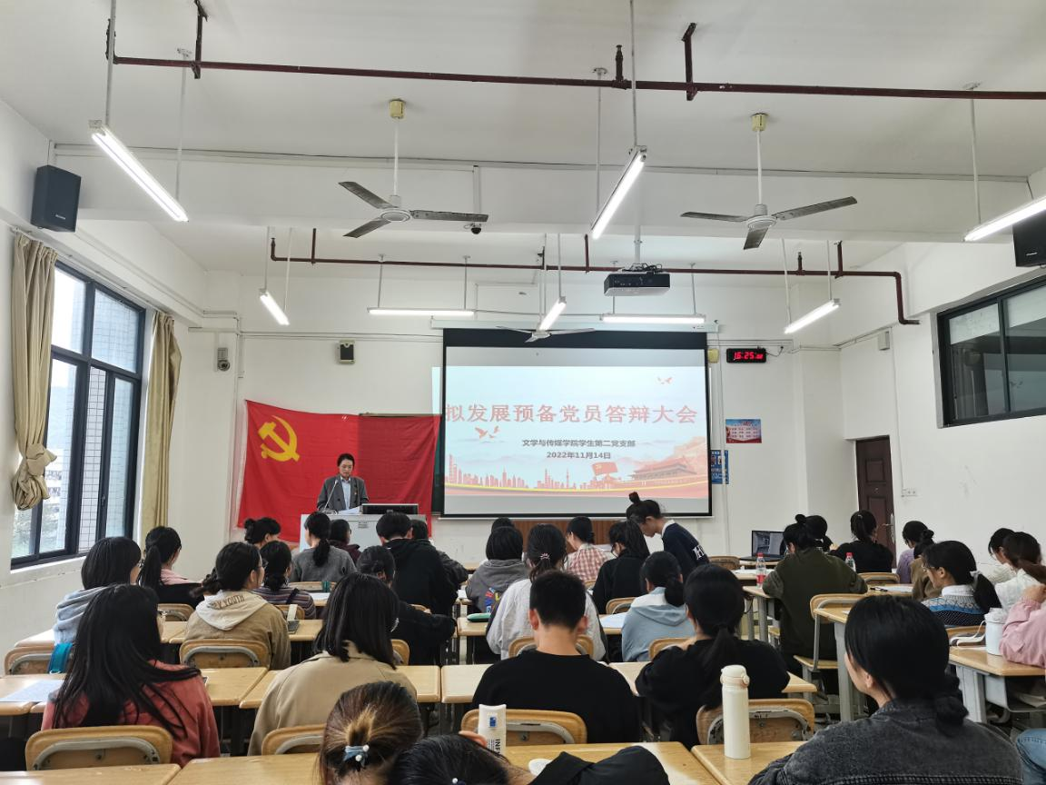 2022年11月14日上午,文传学院员工第二党支部在格致楼309教室召开了2022年下半年拟发展预备党员答辩会。本次会议由文传学院员工第二党支部书记韦金朋主持,公司党委副书记纪委书记韦振宇和教师党员银晓明及全体在校生党员参加。