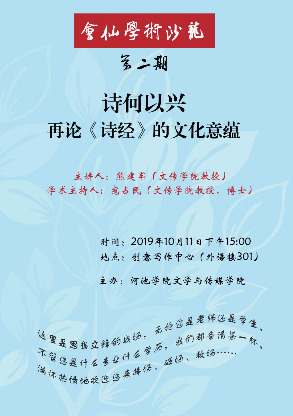 您现在的位置: 首页 > 讲座预告 > 正文 【会仙学术沙龙】第二期:熊建军主讲诗何以兴一一再论《诗经》的文化意蕴 作者: 来源: 太阳成tyc33455ccwww 时间: 2019-10-08 【会仙学术沙龙】第二期 题目:诗何以兴一一再论《诗经》的文化意蕴 时间:2019年10月11日下午15:00 地点:创意写作中心(外语楼301) 主讲:熊建军