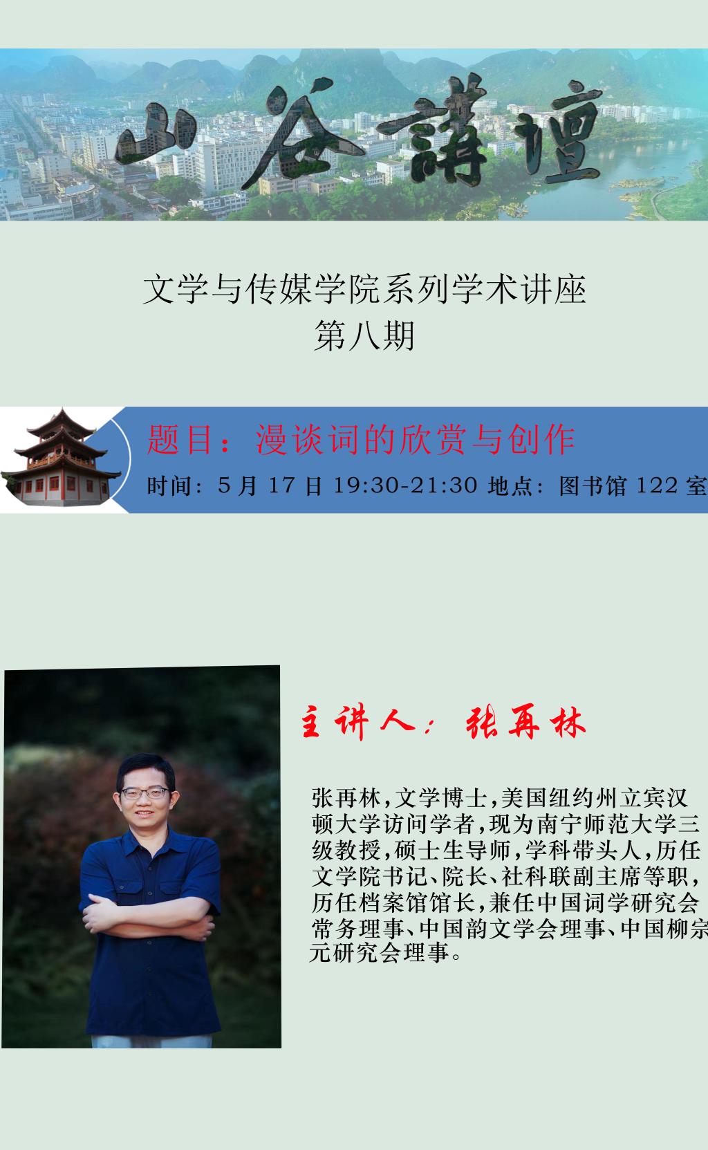 张再林,文学博士,美国纽约州立宾汉顿大学访问学者,现为南宁师范大学三级教授,硕士生导师,学科带头人,历任文学院书记、经理、社科联副主席等职,历任档案馆馆长,兼任中国词学研究会常务理事,中国韵文学会理事、中国柳宗元研究会理事。
