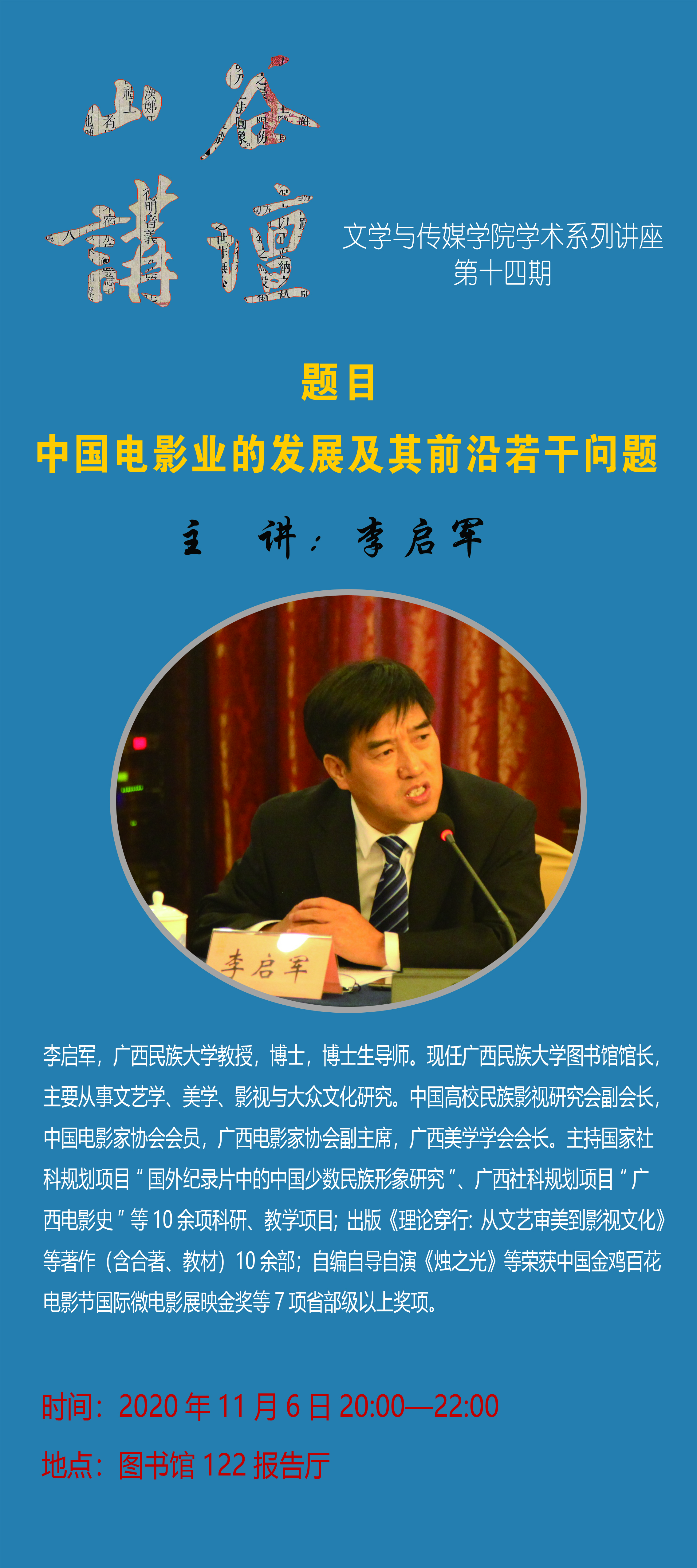 李启军,广西民族大学教授,博士,博士生导师。现任广西民族大学图书馆馆长,主要从事文艺学、美学、影视与大众文化研究。中国高校民族影视研究会副会长,中国电影家协会会员,广西电影家协会副主席,广西美学学会会长。主持国家社科规划项目“国外纪录片中的中国少数民族形象研究”、广西社科规划项目“广西电影史”等10余项科研、教学项目;出版《理论穿行:从文艺审美到影视文化》等著作(含合著、教材)10余部;自编自导自演《烛之光》等荣获中国金鸡百花电影节国际微电影展映金奖等7项省部级以上奖项。