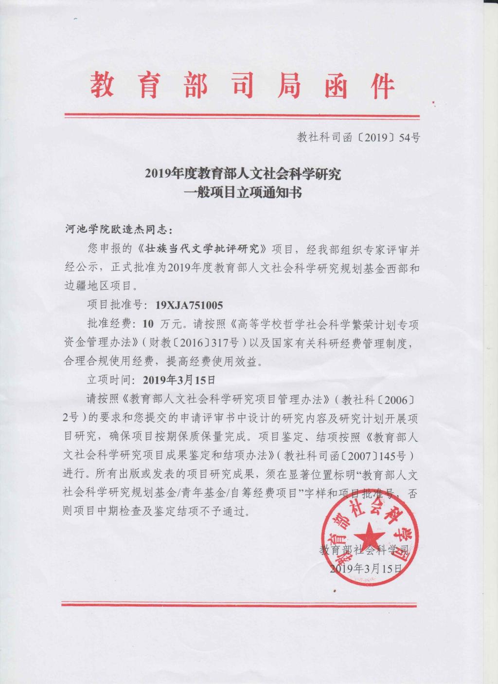欧造杰获得2019年度教育部人文社会科学研究一般项目立项